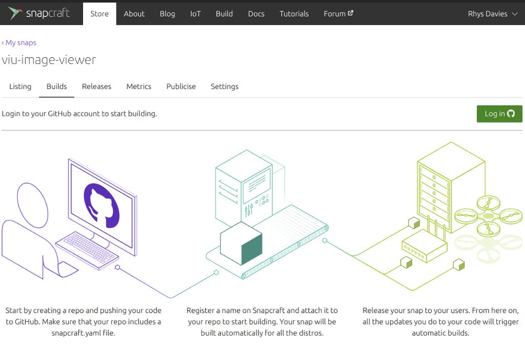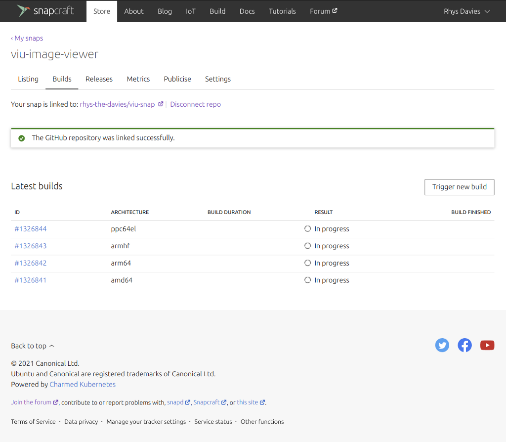 1. Linking everything up to a GitHub repo and connecting it to the build process. This way each time the application is updated in GitHub a new release is built and pushed to the edge channel in the store. To do this, I logged into my snapcraft developer account, selected the viusnap and went to the ‘Builds’ tab and clicked the big green button: