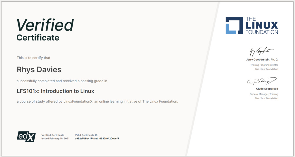 And then, a few weeks ago, I quit the product team to become a developer advocate. Part of my negotiation in taking the new job was that I would get time and money to learn. I wanted to take certifications and grow my understanding. So I could do my job better, yes, but also so I could contribute the way I want to. This process of focused learning started this week. I started the Linux Foundation course on Edex “Introduction to Linux”. And finished it.
