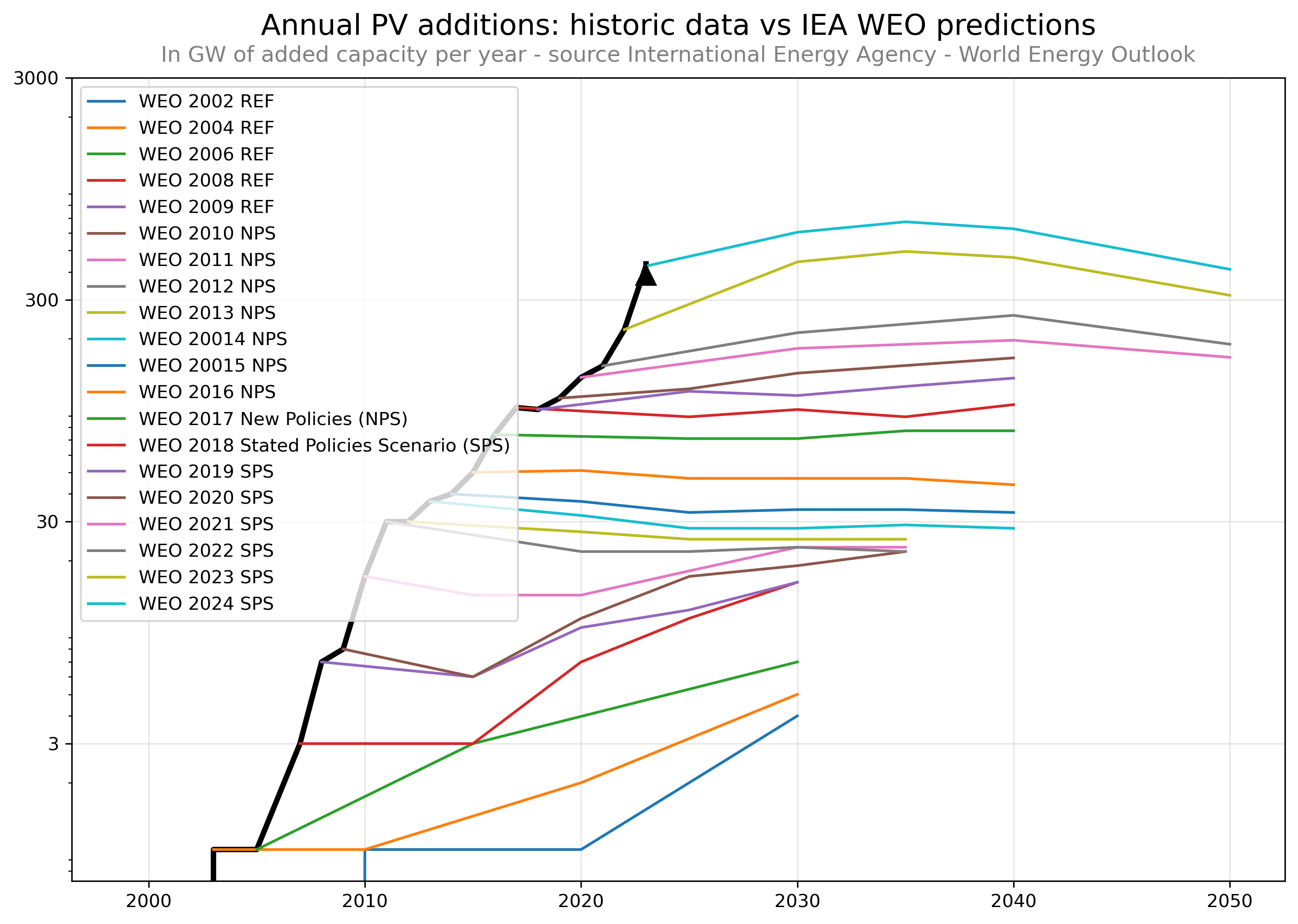 As you can see, every year (except maybe 2012) additional PV capacity drastically increased more than projected.