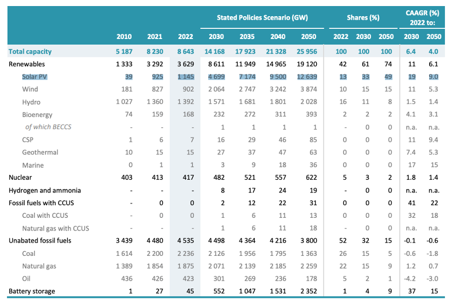 The data for the graph from before comes from tables that are always at the end of the report in the Annex, on pages that are always titled something like ‘World electricity sector’, in tables titled ‘Total capacity’, measured in GW (gigawatts) that give the previous and projected capacities for renewable energy sources (including PVs), nuclear, hydrogen and ammonia, fossil fuels with CCUS (carbon capture utilisation and storage), unbated fossil fuels, and battery storage.
