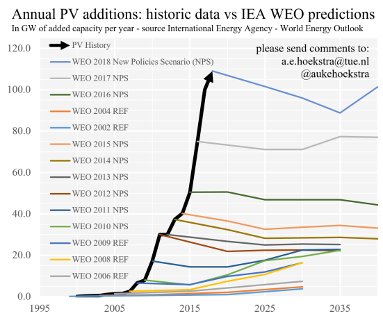 This statement alludes to a slowing down of solar capacity but the same graph referenced by the author(s) in 2017 was given again in 2018 and clearly shows they’ve noticed the step up in additional PVs ,and reduction of retiring PVs. Strange from the WEO but starting to look better for accurate predictions.