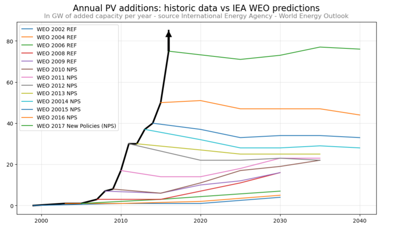It shows that between the years 2006 and 2018, when the International Energy Agency (IEA) made projections about the future capacity of photovoltaic cells (PVs) - solar panels - in their report ‘World Energy Outlook’, they were, year after year, very wrong.