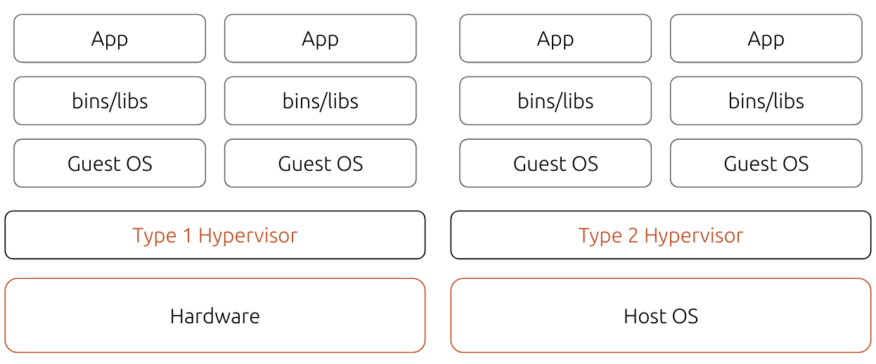 - Type 1: ‘Bare-metal’ hypervisors which interact directly with the underlying hardware and become the OS, except that you only really interact with them through the virtualisation tool. Some examples are: VMware ESXi, Microsoft Hyper-V, and Apple Boot Camp.